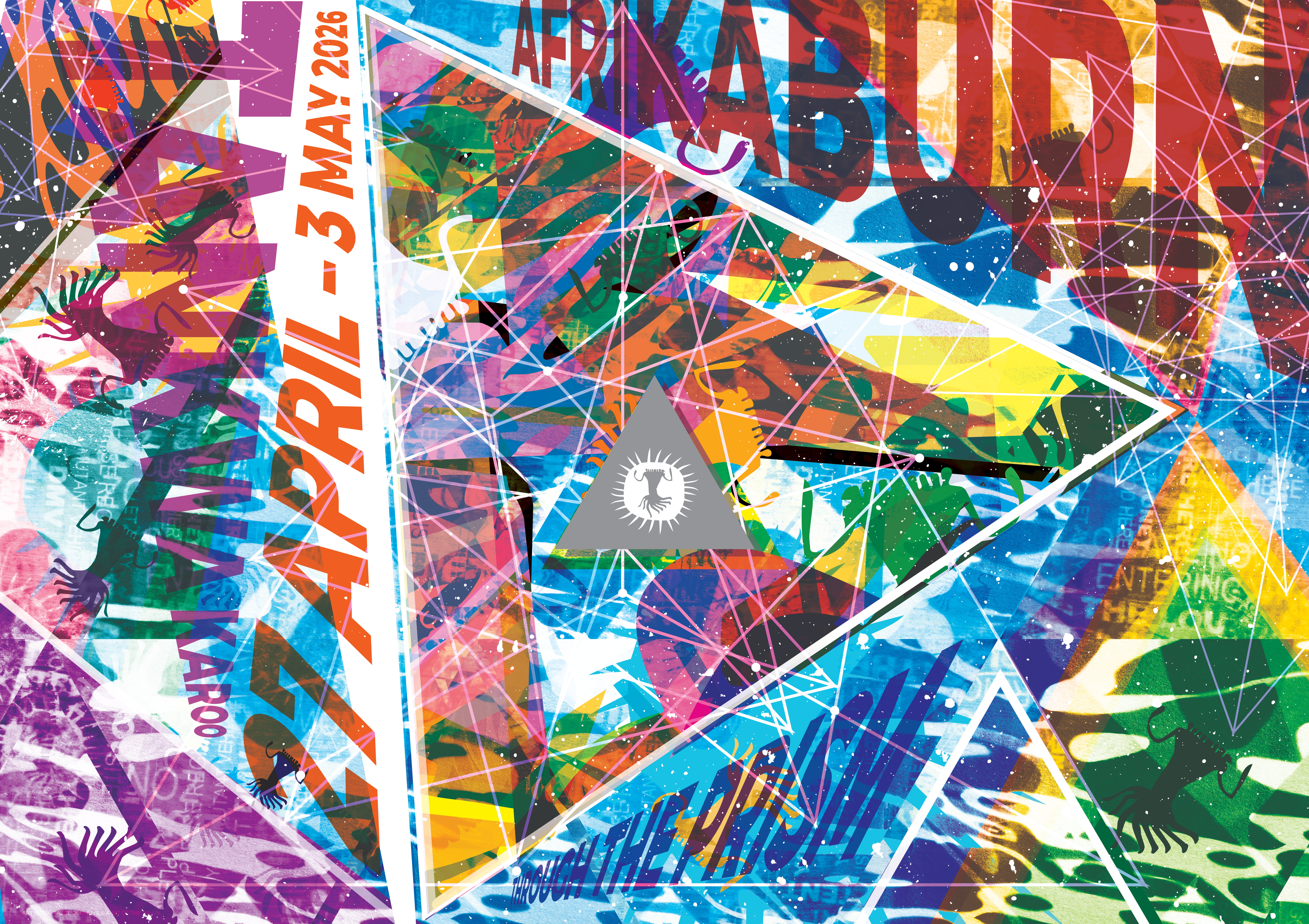 It needed to have a simple visual anchor, a place of calm for your eyes amongst the chaos, and I settled on a simple triangle prism in the centre of the poster with the AfrikaBurn signifier.