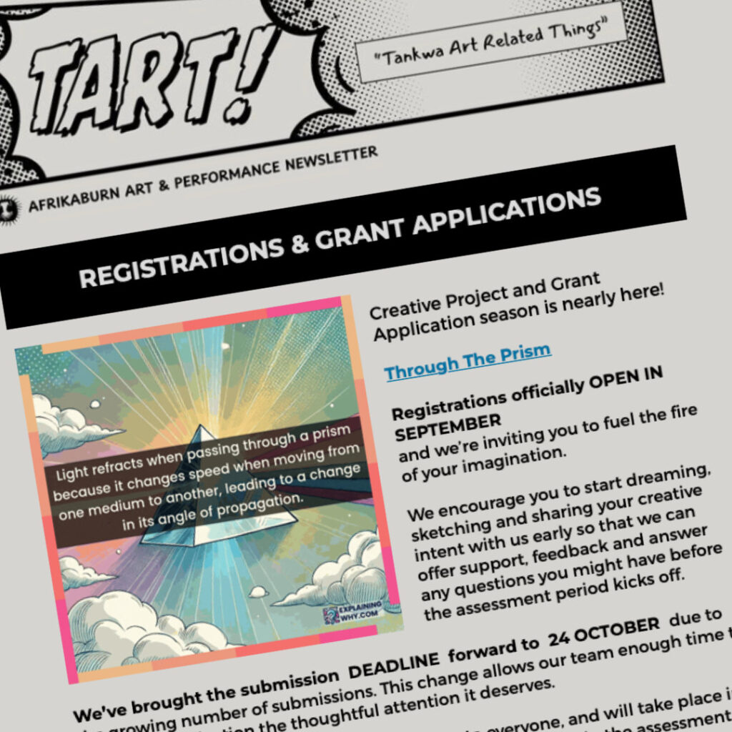 The Creative Grant will NOT cover your labour at the event, performance fees, or your personal event expenses that you would ordinarily require to participate (e.g. AfrikaBurn Event Tickets, travel of the team to Tankwa Town, camping expenses like tents and food, etc.)
