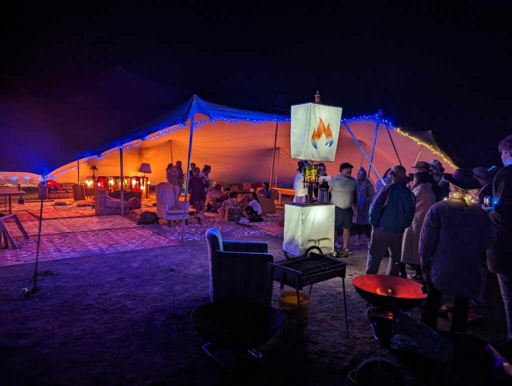 We have the ABnB Rover (mini mutant) that will often operate in the evenings. It serves warm adult beverages. The rover does occasionally leave the safety of the camp and head out on the playa for adventures.