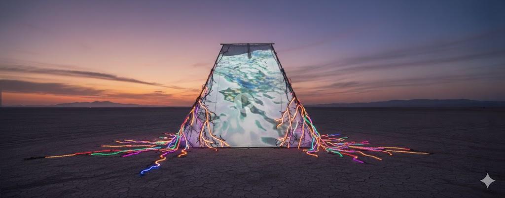 House of Umbra is an installation that brings art and performance from the ethereal to the real. This piece is designed to bring stage performance to the ground level. The House is a 11.42ft height – 95 sq.ft triangular prism with shadow screens on three of its sides. This is a space for dancers, musicians, artists and participants to design a performance in real time. A kaleidoscope of abstract colours and designs are projected on the inside of the structure. Dancers, movers and aerialists play with projections showing the distortion and abstraction of the body, using shadows to facilitate. They transform the House into a space that illuminates their movement, drawing attention to their bodies amongst vibrant projections that create shadows. It is also interactive, a chance for audiences to create and embody sound and images. Passers can enter the structure and play behind the screens. This prism shines bright in the desert, illuminating bodies and creating shadows. Come search for this bright light on your journey and dance in a sea of colour. House of Umbra is an interactive light installation that welcomes all kinds of performers to get lost in its light.