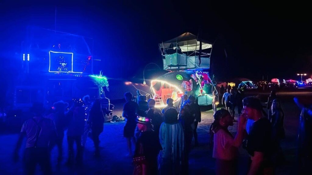 We host anything in the front of our camp that is open to all Burners – it is normally 300m2 shaded with small tables and chairs -where early morning yoga stretches follows by ambient chill music and 420 vibes to juice bars and fresh produce hand outs leading up into afternoon cocktail bars into night time to legendary parties and performances that we are known for.