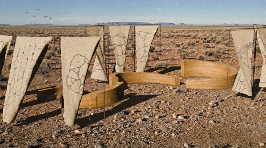 Tracings of Impermanence is a land-based spatial installation for the Tankwa /Karoo desert ecology. The project is conceived as a cartographic sigil created from the earth it stands upon and is raised as a witness to the entanglement of species and forces across time. We propose this structure as an invitation to sense the desert as a living field of forces and lineages: wind, water, heat, dust; migration routes of birds and animals; indigenous flora; the movements of pastoralist peoples suchas the San and Khoekhoe; the treaded path of the voortrekker, and of course an ancient ocean that once covered this basin, leaving mineral memory in the playa.